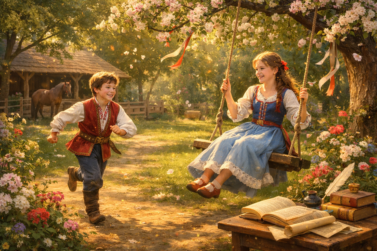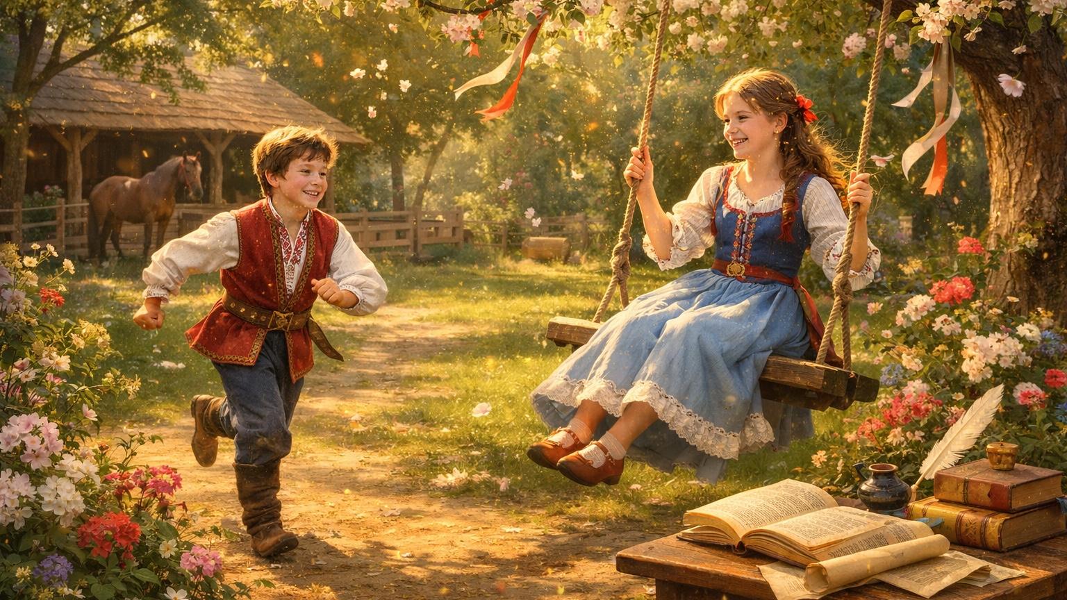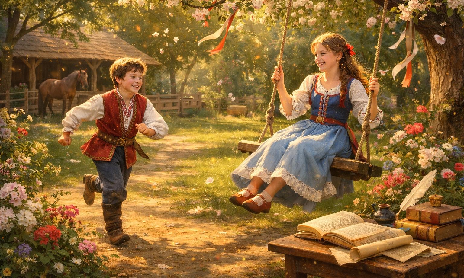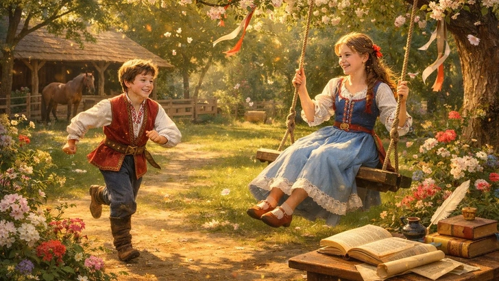 Мальчик встал и побежал в сад, где сестра качалась на качелях, чтобы предложить ей провести время вместе.