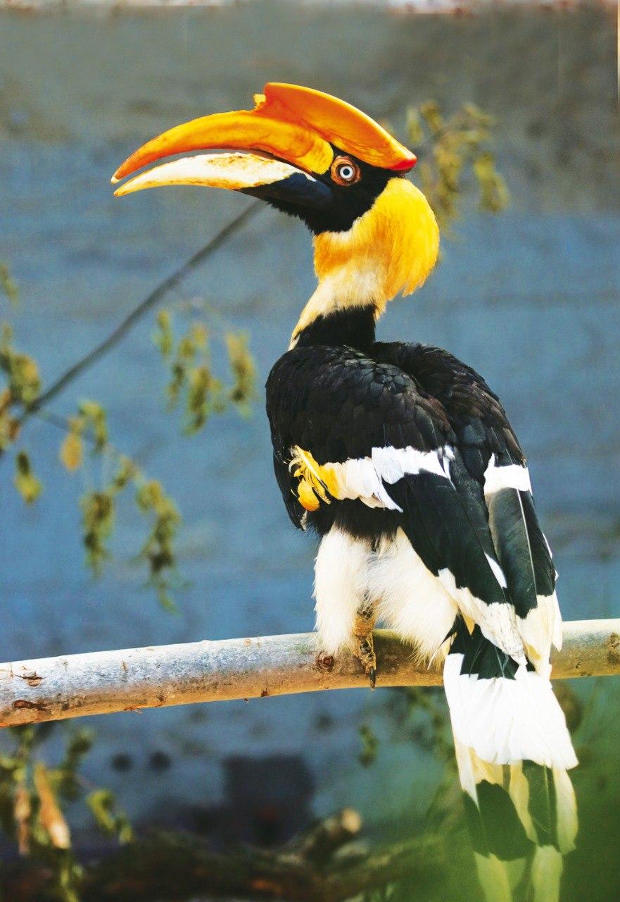 Двурогий калао (Buceros bicornis) из семейства птиц-носорогов относится к числу самых крупных представителей своего рода и может прожить до 50 лет. Длина его тела достигает 1,5 м, питается птица преимущественно тропическими фруктами — большой дефицит на улицах Петроградской стороны в начале октября.