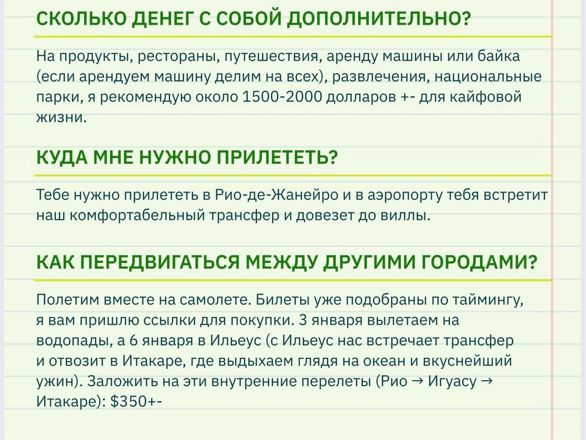 Так, девушка писала, что в поездку стоит взять 1,5-2 тысячи долларов (100-150 тысяч рублей), хотя никто из участников не уложился в эту сумму. «У нас было несколько внутренних перелетов, по которым мы ждали информацию от Вики. Она была дана в последний момент. В итоге только один перелет Игуасу — Итакаре вышел в 350 долларов (27 тысяч рублей)», — отметила она, добавив, что во столько, по изначальным утверждениям, должны были встать все перелеты. Впоследствии «тревел-подружка» призналась, что в прошлый раз все расходы оплачивал ее парень.