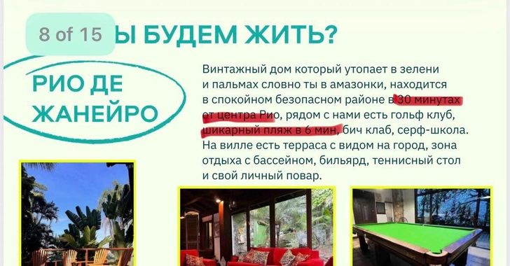После того, как Елена добралась до виллы в Рио, выяснилось, что условия проживания гораздо хуже, чем обещала «тревел-подружка». Так, она без согласования поменяла локацию в 30 минутах от города и в 6 минутах до пляжа на другую, из которой нужно было добираться более часа без пробок на такси до центра и 15 минут до океана.